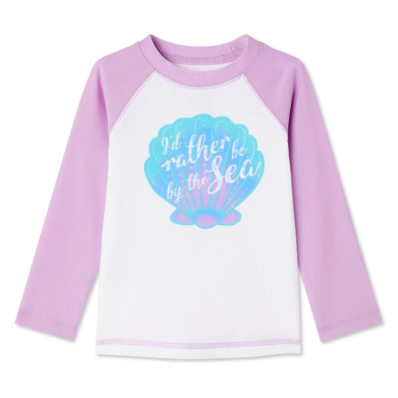 A beach day with the family calls for George toddler girls’ long sleeve rash guard. Made with 4-way stretch, it’ll be perfect for movement when she’s in the water and out making sandcastles. The rash guard is designed with UPF 50 protection, a crew neckline, long raglan sleeves, a cute front graphic print, a colour blocking design, and a straight hem. Dress it with swim or board shorts.