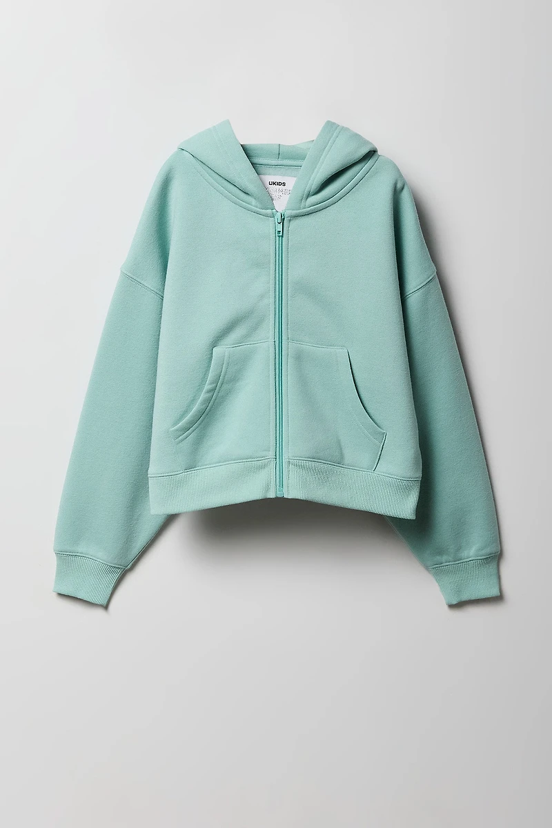 This hoodie features fleece material, hood, zip-up front, split kangaroo pocket, long sleeves, ribbed knit trim, and skimmer length.