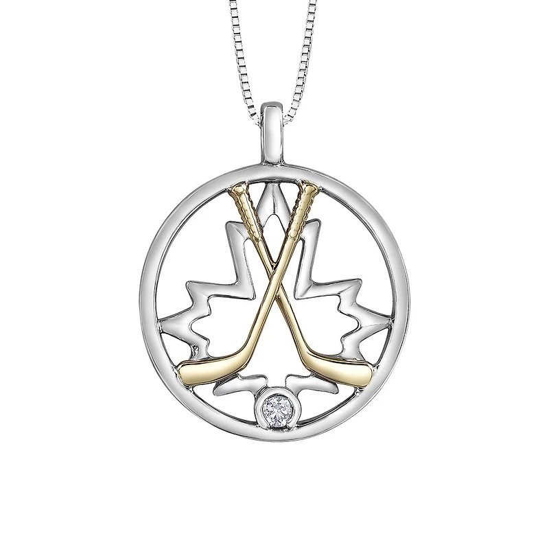 Hockey is Canada's favorite winter pastime and what better way to show your love of the sport with this sterling silver and 10kt yellow gold pendant. An artfully sculpted maple leaf is adorned with hockey sticks and a diamond puck. The 0.03ct Glacier Fire Canadian diamond add to the unique Canadian-ness of this beautiful pendant. The pendant skates gracefully on an 18" box link chain. Every purchase of a Glacier Fire diamond is accompanied with a Certificate of Authenticity which confirms that the diamond was mined in Canada.