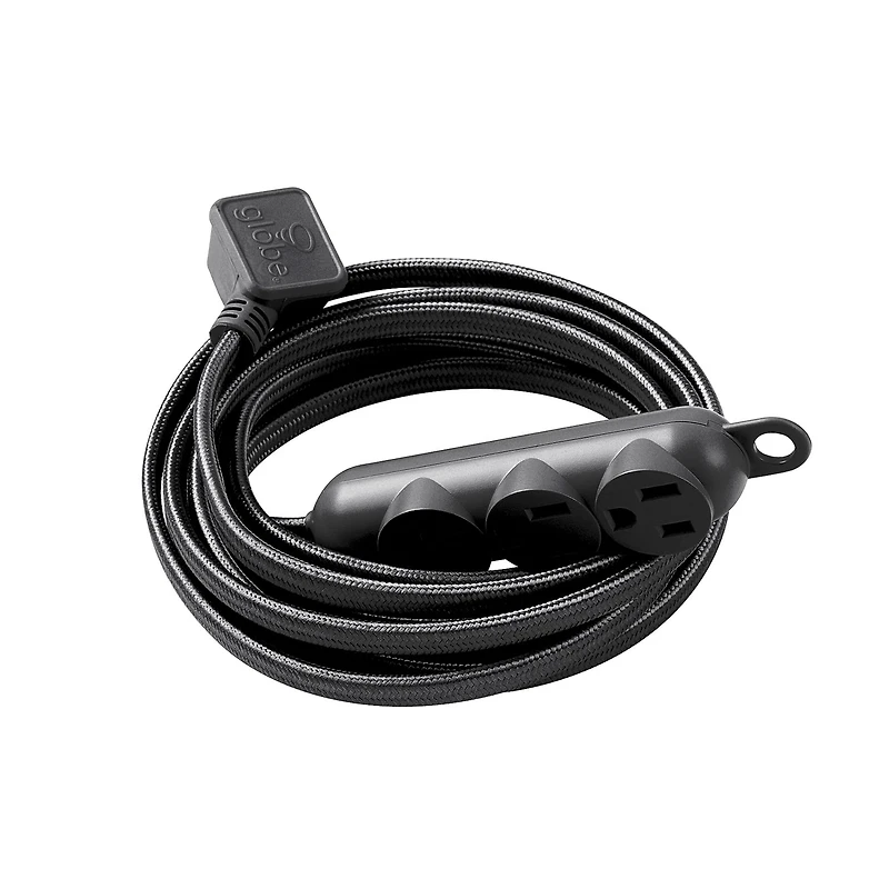 Globe Electric's Fabric Extension Cord with three grounded outlets is a stylish alternative to traditional extension cords. Designed with style in mind, the sleek black fabric cord stands out in just the right way. Extending to 12 feet, or 3.7 meters, you can bring your outlets where you need them most. Fitted with three grounded outlets you can plug in your electronics easily and without hassle. An integrated hanging hook allows you to place your cord where it is most useful - under a table for easy access, above your counter for extra outlets, behind your desk, at your night stand - the options are endless! Extend the cord fully before use. Capable of using 1,625 watts max. To achieve optimal performance, use the cord within the recommended electrical rating.