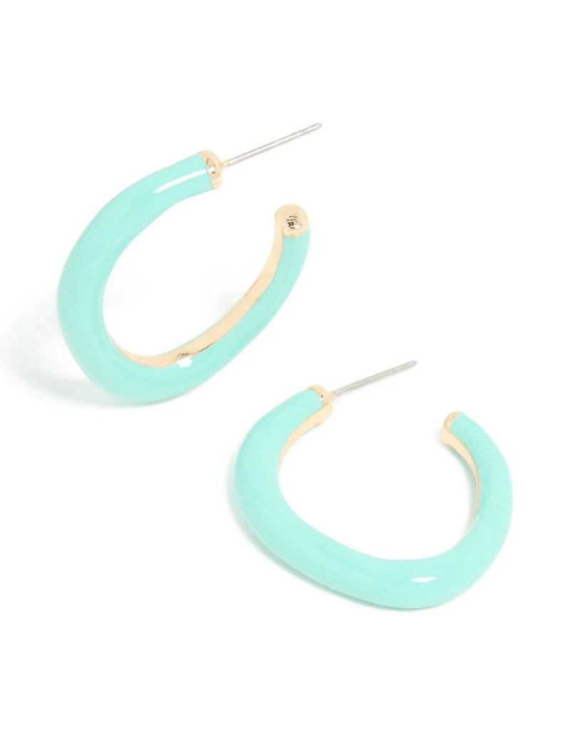 Bring a splash of colour to your look with these Gold Aqua Enamel Irregular Hoop Earrings. These fun enamel hoop earrings feature a playful irregular hoop shape and a fresh aqua finish that pops against the gold tone. Perfect for weekends, parties or a night out, these fashion earrings style easily with a slip dress, a blazer and jeans, or a simple tee. Lightweight and eye–catching, they’re your new go‑to gold hoop earrings when you want effortless, curated style with a cool, modern twist. Material: Enamel Colour: Gold, Blue Dimensions: Length 30 mm x Width 3 mm