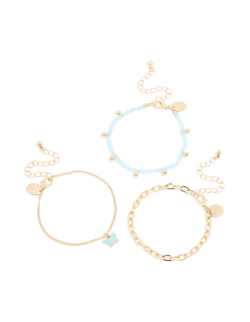Gold Blue Beaded & Butterfly Charm Bracelets 3-Pack