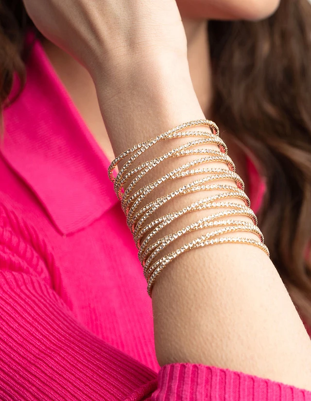 Gold Diamante Cross Over Eight Row Cuff Bracelet