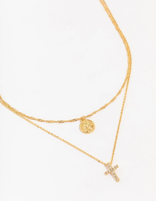 Gold Plated Brass Cubic Zirconia Cross Coin Layered Necklace