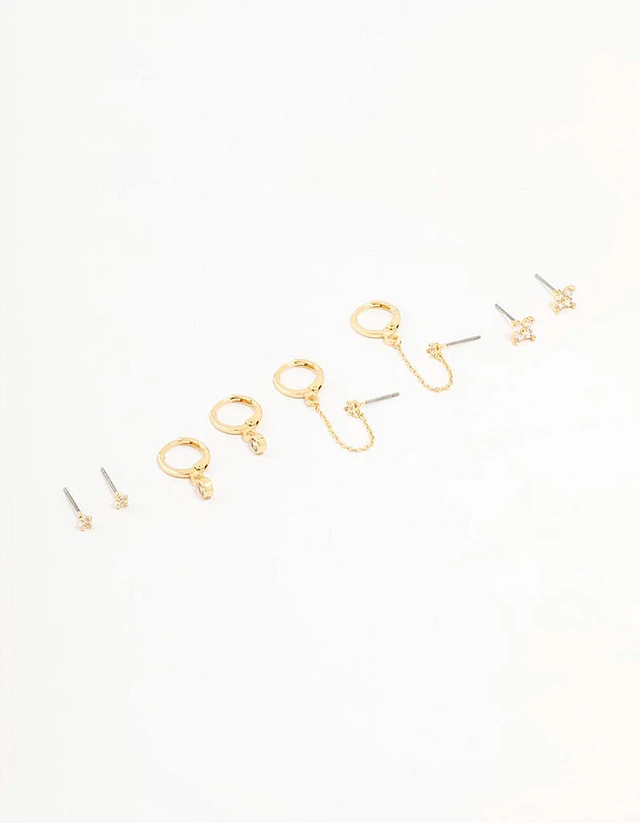 Gold Plated Molten Huggie & Cubic Zirconia Chain Earrings 4-Pack