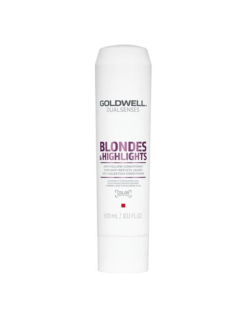 Goldwell Dualsenses Blondes & Highlights Conditioner - 300ml For blonde and highlighted hair. Brings out color luminosity and neutralizes unwanted yellow tones for blonde color reflections. The new Luminescine technology transforms non-visible UV light into visible light for magnificent brilliance. Detangles immediately and neutralizes unwanted yellow tones for luminous blonde color reflections. Use Work through wet hair and rinse thoroughly.