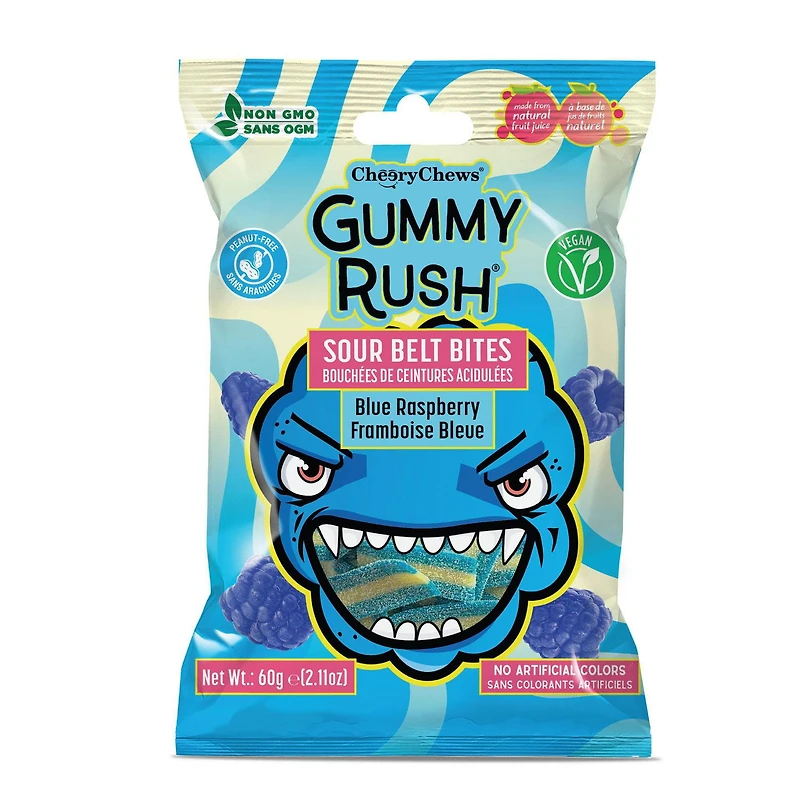 Enjoy a burst of sweet and tangy blue raspberry flavour in every bite with Gummy Rush Sour Belt Bites. These fun, chewy treats come in a convenient 60 g pack, perfect for sharing or snacking on the go.