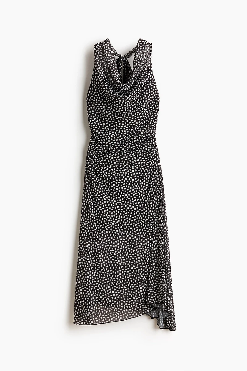 Knee-length dress in sheer mesh. Wide halterneck straps, cowl neck at front, and an open back. Gathers at sides for a draped effect, and gently flared skirt with an asymmetric hem. Partly lined.