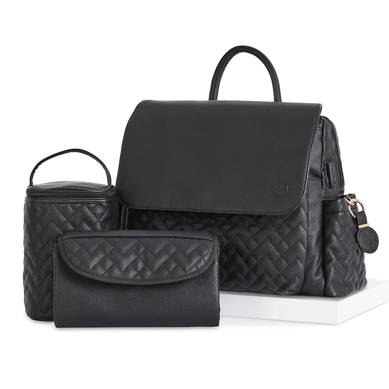 The Hannah & Sophia Traveler Diaper Backpack 4-piece Set is designed for parents who need organization and style. This versatile set includes a diaper backpack, insulated lunch bag, water-resistant changing pad with a built-in pillow, and a detachable AirTag keychain for added security. With 11 total pockets (4 exterior, 7 interior), there’s room for diapers, wipes, clothes, and even an electric or manual breast pump. The built-in USB-C port lets you connect your own power bank (sold separately) to keep your devices charged all day. Designed for convenience, it features removable stroller straps and an adjustable messenger strap with metal hooks for multiple carrying options. The brushed metal-finish hardware, magnetic closures, and foot rivets add durability and style. The included water-resistant changing pad features a magnetic closure and a built-in pillow for extra comfort. Don’t forget about the detachable AirTag keychain! This feature prioritizes safety for your peace of mind. Clip the keychain onto your child during outings or keep it on the bag for easy tracking (AirTag sold separately). Available in three stylish colors Midnight Black, Forest Green and Moonmist Blue, the Traveler makes parenting on the go effortless!