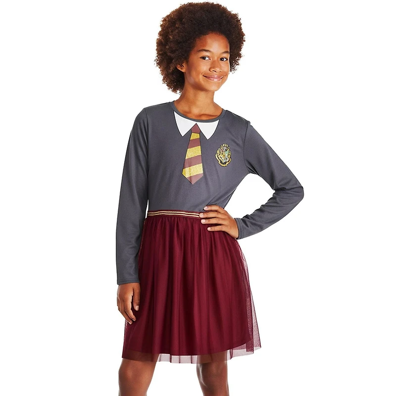 Resemble your favourite characters with Harry Potter girls' tutu dress. It’s made of soft jersey knit for all-day comfort. The dress is designed with a classic crew neck, long sleeves, a gathered waistband, a front graphic print, and a mesh skirt overlay for added style points. It includes an inner lining for added coverage. Pair this Hogwarts look with sneakers, combat boots, or flats for a complete look.