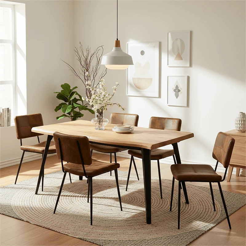 This 5-piece dining set by Homy Casa combines industrial design with warm, rustic finishes for an inviting dining experience. The 63-inch rectangular table features a thick 40mm MDF top with a lifelike wood look and elegant wave edges. Robust steel legs offer stability and modern appeal. The faux suede upholstered chairs deliver vintage charm with a soft, easy-to-clean surface and breathable cut-out backs. Ideal for apartments, kitchens, or cozy dining rooms.
