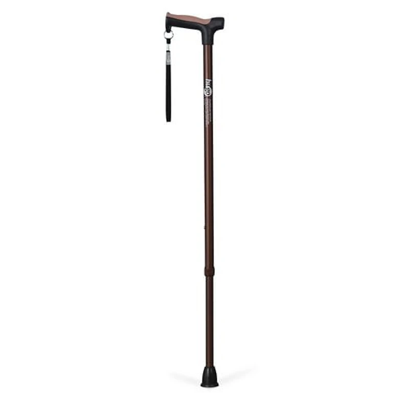 Canes with derby handles by Hugo are everything you want in a cane and much more. These height adjustable ebony colored derby canes can accommodate most people between 5' - 6'.5" and are durable, versatile and stylish. The Hugo Derby Cane has a shock absorbing cushion-top handle with reflective strap for added night time safety. Hugo Derby Canes incorporate push buttons to provide 12 precision height settings, supporting up to 300 lbs. The ergonomic derby cane handle is designed to fit more comfortably in your hand, while the Ultra-Grip Cane Tip provides superior grip and helps absorb impact shock throughout the walking motion. This Hugo mobility aid is manufactured of heavy-gauge anodized aluminum to provide durability while being light weight.