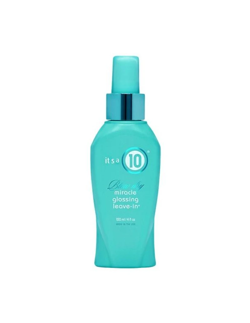 It's A 10 Miracle Blow Dry Glossing Leave-In - 120ml Get gorgeously silky hair with intense shine using Glossing Leave-In. This highly effective formula moisturizes and fortifies the hair shaft while adding a weightless smoothing effect. Defend against heat, UV damage, breakage, and more with the added benefit of this must-have secret for irresistibly manageable and glossy hair. 10 Benefits: