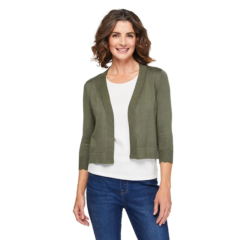 Add a chic, stylish layer to your looks this season with Iyla women's 3/4 sleeve knit shrug. Made of a soft knit fabric, it features an open-front style, 3/4 length sleeves, and lettuce cuffs for a cute touch. The ribbed trim at the neck, cuffs, and hem add texture and dimension to this versatile piece. Perfect for layering over tops, T-shirts, or dresses, it's a must-have addition to your collection.