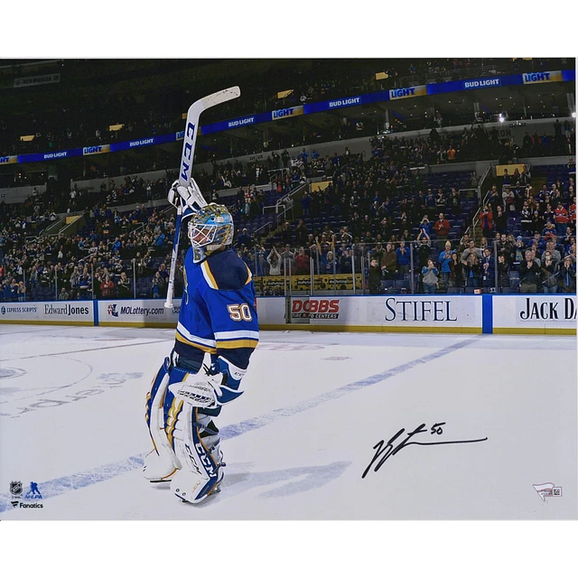 Jordan Binnington St. Louis Blues Autographed 16" x 20" Stick Salute Photograph