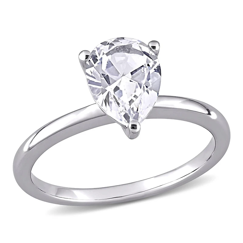 Bedazzle your loved one with this trendy Created White Sapphire Solitaire Engagement Ring. Crafted to elegance in lustrous white gold, this ring features a pear-cut, prong-set created white sapphire gemstone (9 x 7mm) at the center forming a solitaire style. This gemstone engagement ring has been enhanced with a high polish finish and is perfect to make your bride shine on your day special.