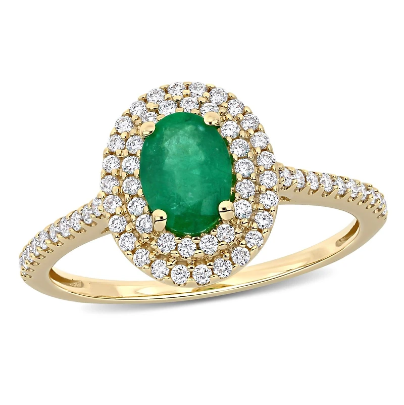 This ring is a true show stopper! This lovely double halo design hugs this beautiful emerald with twinkling diamonds surround. It is a gorgeous piece that makes a real statement. The 14-karat yellow gold setting is a stunning piece that truly embodies and picture frames these stunning stones.