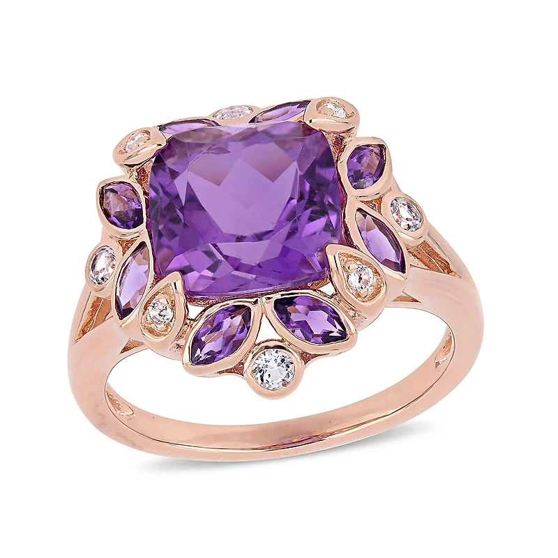 This stunning amethyst, African-amethyst and white topaz mosaic halo ring is crafted in rose gold plated sterling silver and features a cushion-cut, prong-set African-amethyst at the center with eight marquise-cut, bezel-set African-amethysts with eight round-cut, bezel and prong-set white topaz set together in a unique marquise floral halo design. This gorgeous gemstone ring is sure to be a standout addition to any jewelry collection. Coordinate this ring with any ensemble and instantly add a touch of color and elegance to your look.