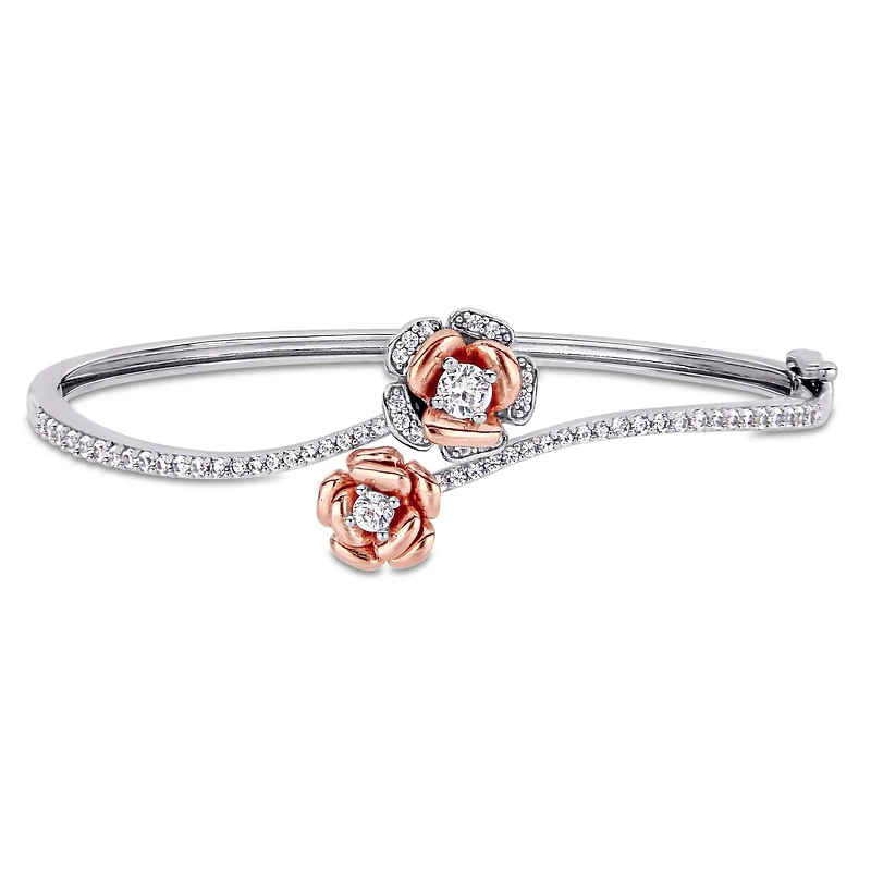 So feminine, so beguiling, she'll want to wear this shimmering White Sapphire Floral Bangle every day. Crafted in rose rhodium-plated sterling silver, this fanciful floral design features two flowers with a round-cut, prong-set created white sapphire at the centre of each one. Additional created white sapphire gemstones resting around this bracelet. Enhanced with a high polish finish, this bangle opens with a hinge for easy wear. Let this simple and elegant gemstone bangle enhance the beauty of your relationship.