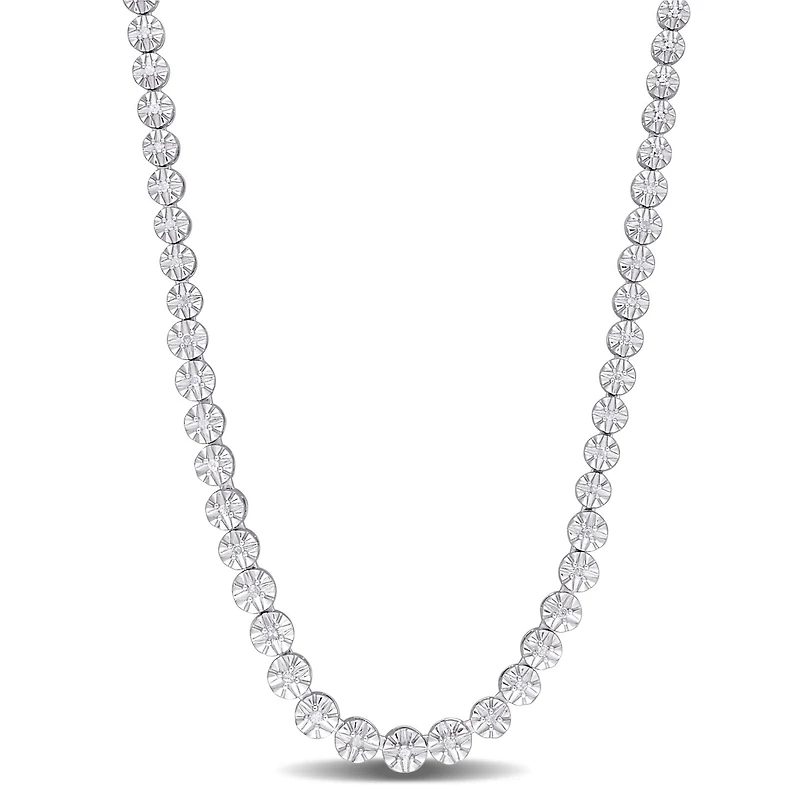 Wear this dazzling Diamond Tennis Necklace with any ensemble for a polished look. Mounted in flickering sterling silver, this necklace features 37 round-cut, gleaming diamonds (H-I-J, I3) that are embellished on the necklace in a shared-prong setting. This necklace measures 17-inches in length and makes for a wonderful gift. Enhanced with a high polish finish, this layerable necklace is a valuable addition to any jewellery collection. Coordinate this simple yet classic necklace with any attire for a breath-taking look.