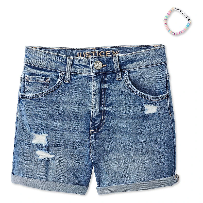 Add a classic-cool touch to her summer style with Justice girls’ mini mom short. Made of denim, they’re designed with a bit of stretch for lasting comfort. The shorts feature a button and zipper fly closure, belt loops, a 5-pocket design, distressed details, and cuffed hems for a laid-back finish. Complete with a matching bracelet, they’re perfect for pairing with her favourite tees and tanks all season long.