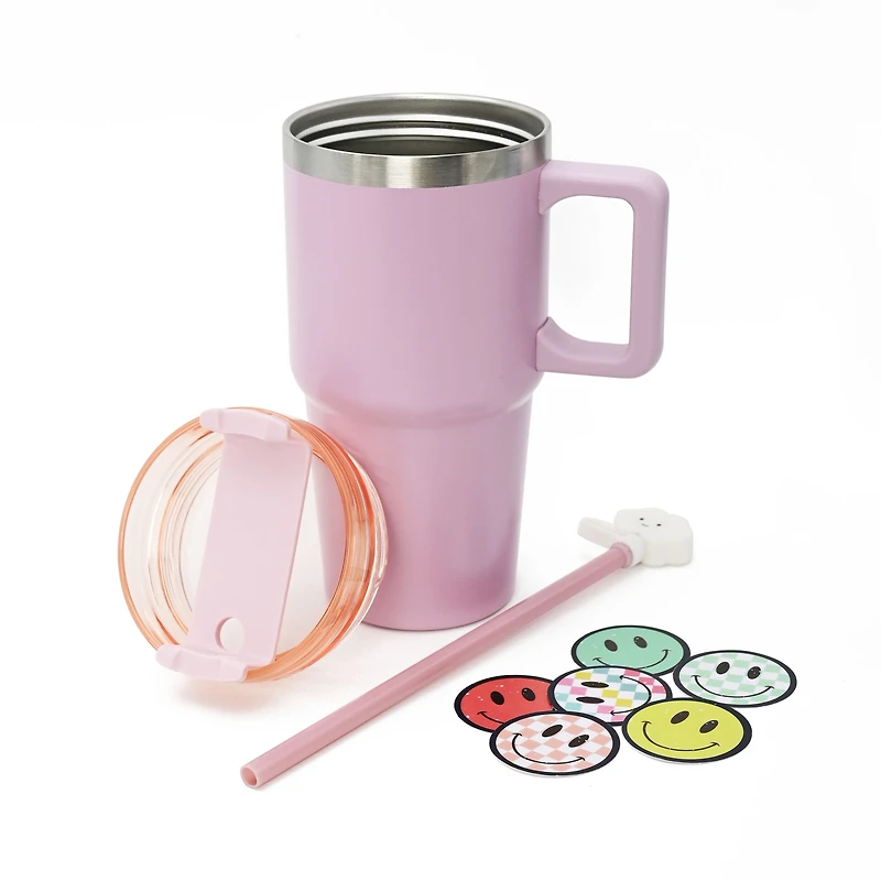 Kids Pink 20oz Stainless Steel Tumbler with Straw, Cloud Straw Topper & 6 Removable Smiley Stickers