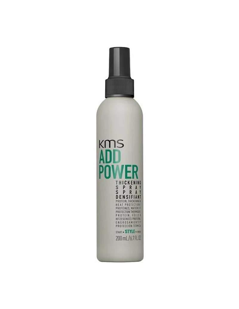 KMS AddPower Thickening Spray - 200ml Hold 2 / Shine 3 KMS ADDPOWER Thickening Spray is a specialized hair product designed to enhance the fullness and strength of fine hair. It provides thermal protection and a light hold, making it ideal for those seeking to add volume and resilience to their hair. Makes fine hair look and feel noticeably thicker For more gentle styling with 90% less damage Provides heat protection up to 200°C INNOVATIVE SHAPING BLEND Polyquaternium-68 – provides flexible setting Rice Protein – known for strengthening and thickening the hair. Organic White Tea – known for being anti-oxidative and lightweight. Use For fine, weak hair. Spray into towel-dried hair and style as usual.