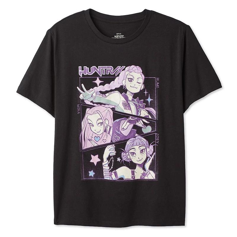 Kpop Demon Hunters women’s Huntrix T-shirt brings bold character energy to your everyday lineup. It’s made of a cotton-rich material for all-day comfort whether you’re lounging around at home or meeting up with friends. It’s designed with a classic crew neck, short sleeves, and a front graphic print. Finished with a straight hem for simple styling, it’s the kind of tee that pairs seamlessly with jeans, cargos, or joggers.