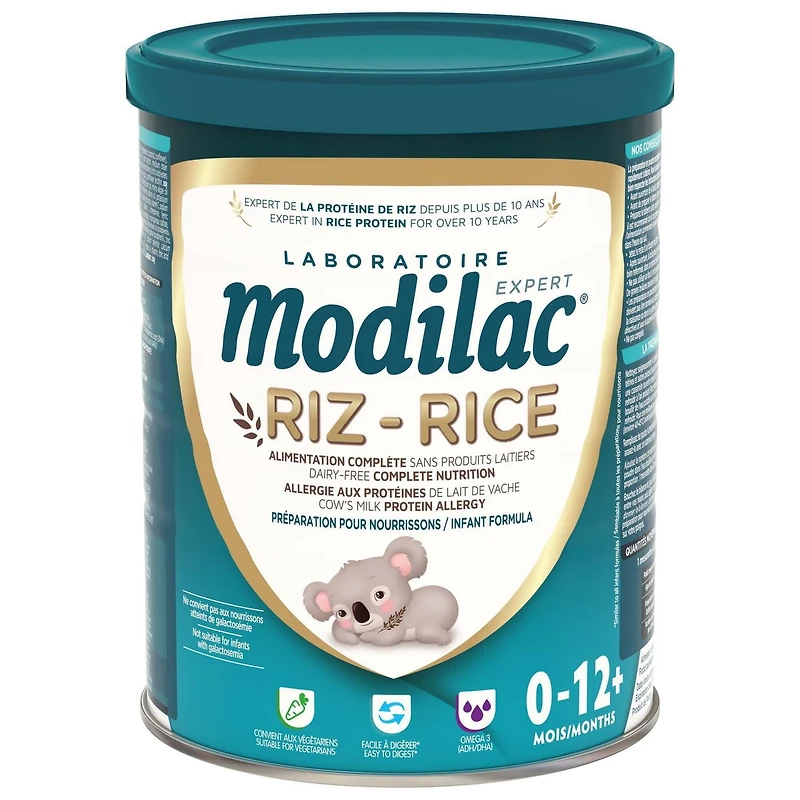 Laboratoire Modilac Rice 0-12+ is a unique complete dairy-free formula, based on rice protein hydrolysate, specially developed for babies allergic to cow's milk protein. It is also suitable for lactose intolerant babies and vegetarians. It contains DHA (omega 3) and ARA (omega 6), calcium. It is GMO free and has a sweeter taste to facilitate its acceptability.