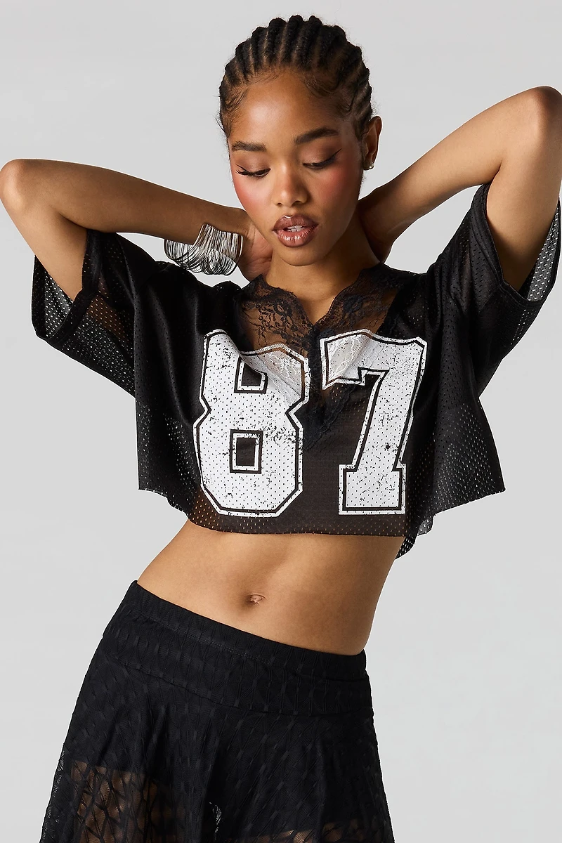 This jersey featured mesh material, graphic front, lace v-neck, short sleeves, striped trim and relaxed fit.
