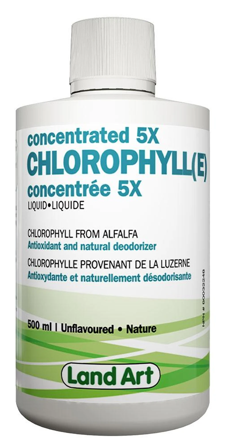 Helping the body to eliminate toxinsPromoting the alkalization and deodorization of the bodyIts detoxifying, anti-inflammatory and antiseptic effectsSupports CleansingDescriptionLAND ART - Chlorophyll 5X Liquid - Unflavoured - 500 Millitre(s) - NPN: 80032248 -- Land Arts Chlorophyll is extracted from high quality, GMO free, wild alfalfa. It is cold extracted without any chemical solvents using a supercritical procedure.Non-pasteurized. Each dose contains 100 mg per 5 ml. Land Arts Chlorophyll is a powerful antioxidant, it helps to decrease bodily odours. Diluted in a glass of water, Chlorophyll is an excellent healthy drink.INGREDIENTS
