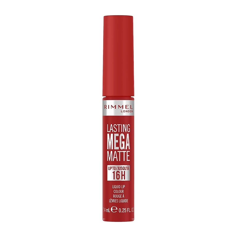 Lasting Mega Matte new liquid lipstick from Rimmel London. Enjoy an intense matte colour with a staying power of up to 16 hours. The Lasting Mega Matte formula contains hydrating mega adaptable pigments that melt onto the lips, leaving a rich matte finish. The matte finish doesn't mean the lipstick is drying. The formula contains squalene and coconut oil, which lips love. The lipstick's ingredients are clean and vegan.