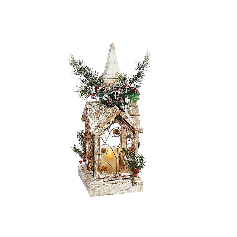 A rustic yet refined accent, this LED Wooden Bell Tower Lantern brings a cozy elegance to your seasonal décor. Inspired by the beauty of autumn, this unique lantern features a bell tower silhouette adorned with ribbons and gems, creating a boho-chic meets farmhouse aesthetic. The built-in soft-glow LED light casts a cozy, inviting ambiance, making it the perfect accent piece for fall, Thanksgiving, and harvest-inspired décor. Whether displayed on a mantel, dining table, or entryway, this LED tower lantern adds effortless charm and sophistication to your space. Features: Designed in a bell tower silhouette with built-in LED light that emits a warm and cozy ambiance, this lantern is ideal for fall evenings and festive gatherings. Material: Crafted with a high-quality wood frame with LED lighting, this white lantern is perfect for fall evenings and festive gatherings. Dimensions: Sold as a set of 1 piece, this wooden white lantern is 5.9 X 5.9 X 15.7 in inches. Use: Lightweight and easy to place on tables, mantels, shelves, or as a centerpiece for seasonal décor, this LED lantern can be paired with pumpkins, candles, or garlands for a cozy seasonal vignette. Care Tips: Wipe gently with a dry cloth to remove dust and maintain the wood’s natural beauty. Avoid direct moisture exposure to protect the wooden beads and LED function.