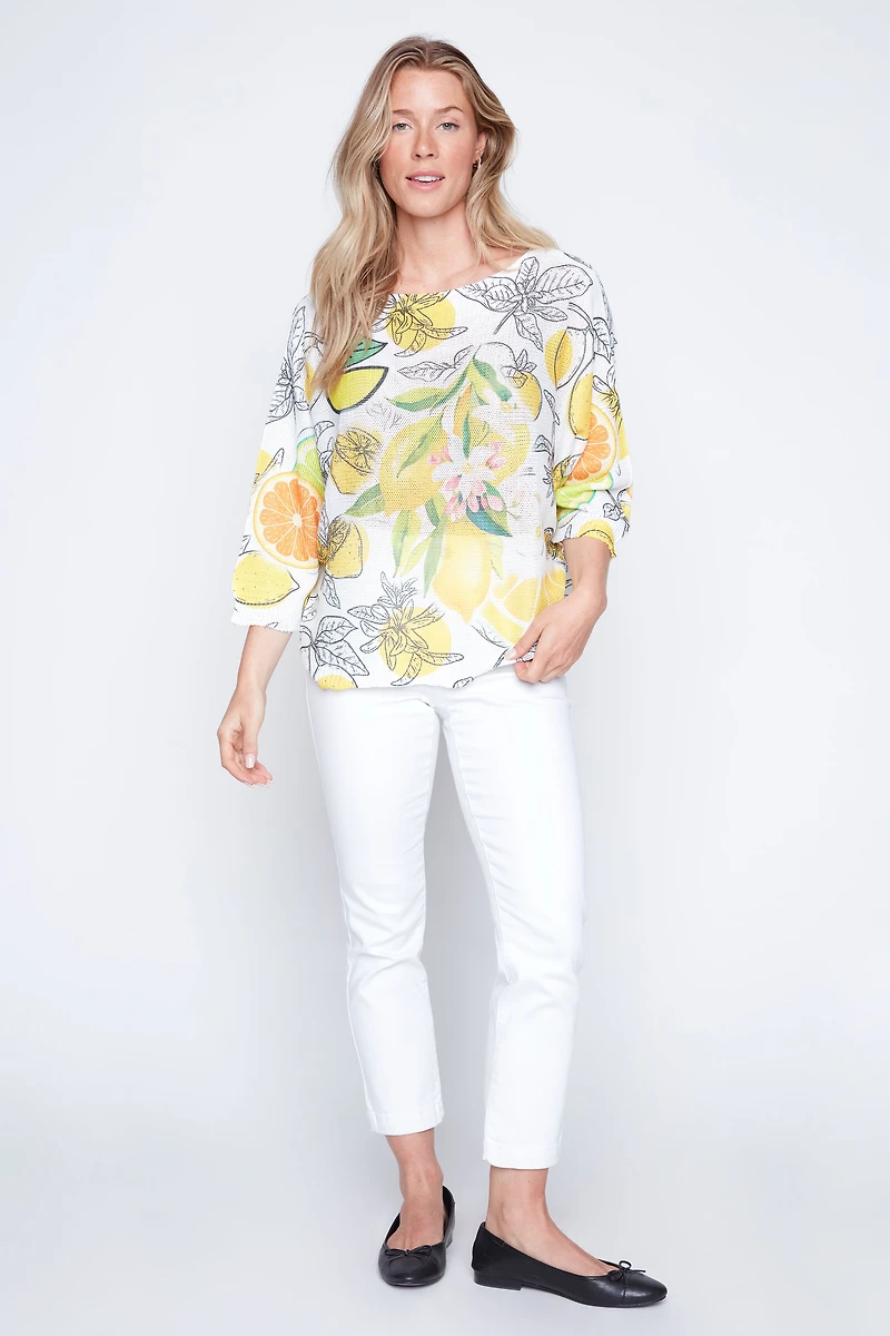 Brighten your wardrobe with this charming lemon print sweater from Via Vitale. Crafted in Italy with a delicate crochet knit fabric, it features a relaxed 3/4 dolman sleeve and a classic round neckline for effortless style. Perfect for layering or wearing solo, this piece brings a citrus-fresh pop of color to any outfit.