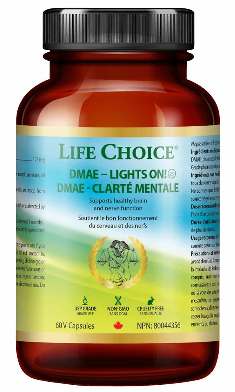 Supports Healty Brain FunctionSupports Healty Nerve FunctionDescriptionLIFE CHOICE - DMAE-Lights On! - 60 vcap - NPN: 80044356 -- Supports healthy brain and nerve function as a precursor to the neurotransmitter acetylcholineDMAE helps elevate mood, improve memory, increase cognitive and learning ability, also physical energy.Many people will take DMAE for its mild stimulant effect, yet DMAE helps most people fall asleep, sleeping more soundly, and having less fatigue during the day. DMAE has the ability to enhance brain functions at the higher level and can compensate for various neuropsychological deficits ranging from cognitive processes to aging itself. DMAE greatly reduces the lipofusion from brain and nerve cells and is able to cross the blood brain barrier.DMAE has proven to be a safe alternative for such learning and behavior problems as Attention Deficit Disorder (ADD) and Hyperkinesias. Other conditions for which DMAE is useful are chronic fatigue, mild depression and confusion.DMAE may also add spice to ones sex life. Dr. Eric Braverman, brain and aging specialist and author of The Healing Nutrients Within, says that aging affects all parts of the body linked with sexual function, both internally and externally. For women and menINGREDIENTS