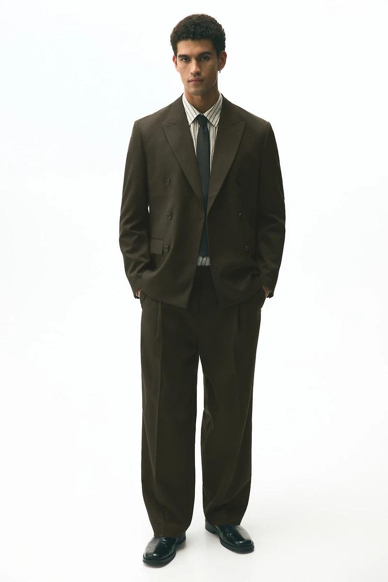 Loose-fit suit pants in soft woven fabric with a generous but not oversized silhouette. Concealed hook-and-bar fastening, zip fly with button, pleats at front, and sharply creased legs. Diagonal side pockets and welt back pockets with button. Tailored design includes added waistband seam allowance for convenient alterations.