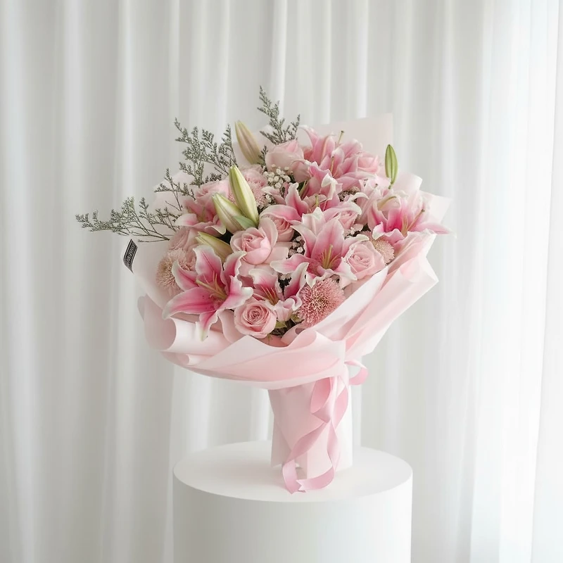 A pink themed bouquet of liles, roses and other fresh flowers wrapped in pink wrapping.