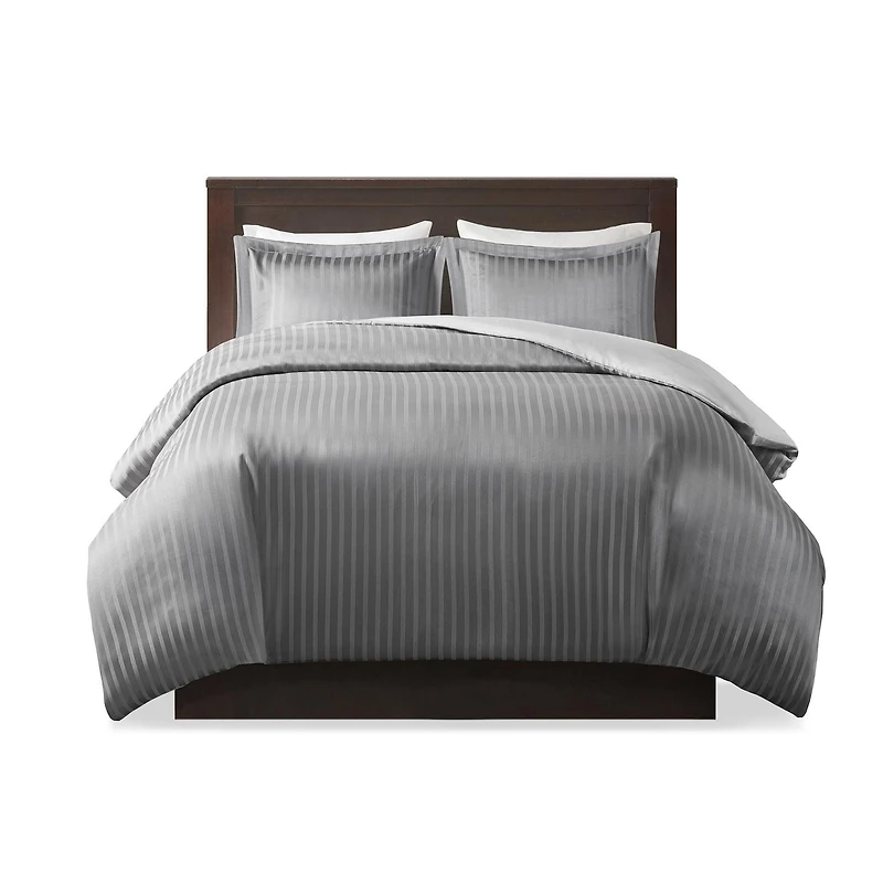 Create a cozy bedroom space with the Madison Park 3 Piece Dobby Duvet Cover Set. This duvet cover set is 100% Polyester providing a soft feel and exceptional comfort. The woven dobby stripe adds texture while the matching shams flaunt the modern design of the duvet cover to complete the duvet set, ready to match your bedroom décor. Machine washable. See care label on product for laundering instructions. Available in double/queen or king depending on availability. (Duvet insert not included)DETAILSPATTERN: StripesCOLOR: Gray or Black depending on availability.SET INCLUDES1 Duvet cover2 Shams• Striped pattern• Duvet cover: Shell: 100% Polyester. Shams: 100% Polyester• Machine washable