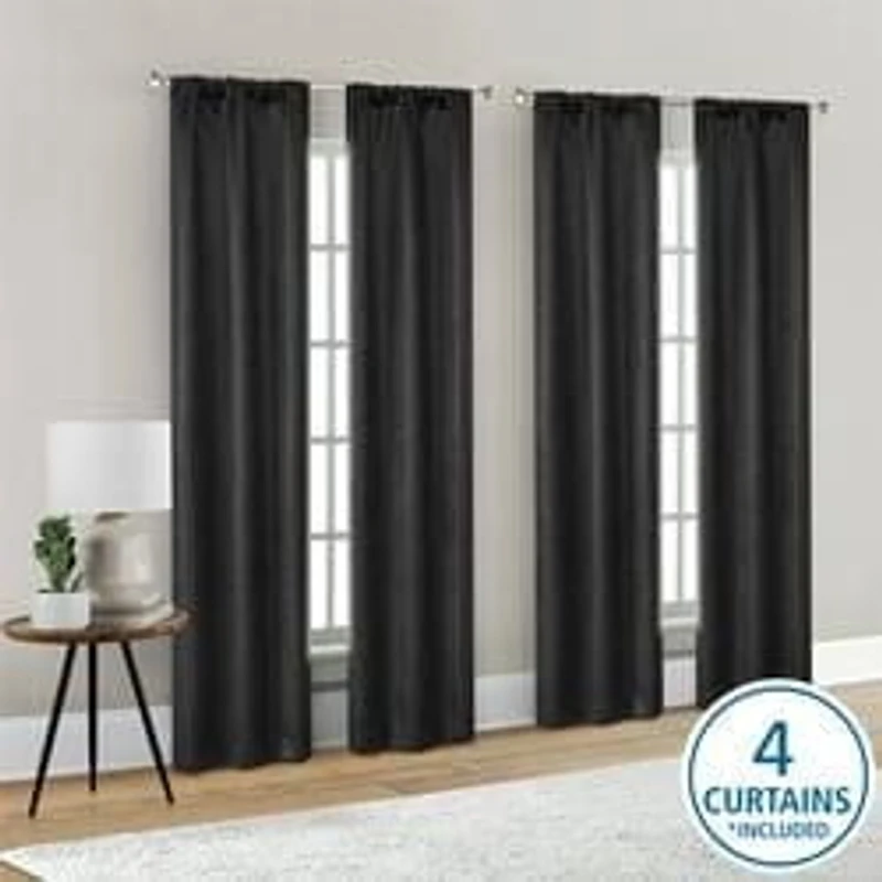 The Mainstays 4 of a Kind Blackout Curtain Panel Set combines style with functionality. These curtain panels, in a convenient four-piece set, are crafted in durable white polyester, effectively blocking light for enhanced privacy. The rod pocket design allows for easy installation and effortless hanging—perfect for bedrooms, home theaters or spaces requiring light control, so you have a sleek and restful ambiance.