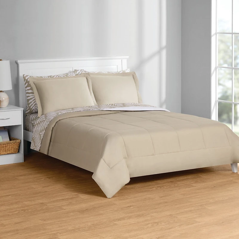 Transform your bedroom with Mainstays Bed-in-a-Bag. This all-season set includes a reversible comforter, a complete sheet set, and matching pillowcases for a perfectly coordinated look. The soft fabric keeps you cozy in winter and cool in summer, making it ideal for year-round comfort. Plus, the set comes with a storage bag, so you can keep it all neat and organized. Stylish, convenient, and oh-so-comfy—everything you need for a great night’s sleep!