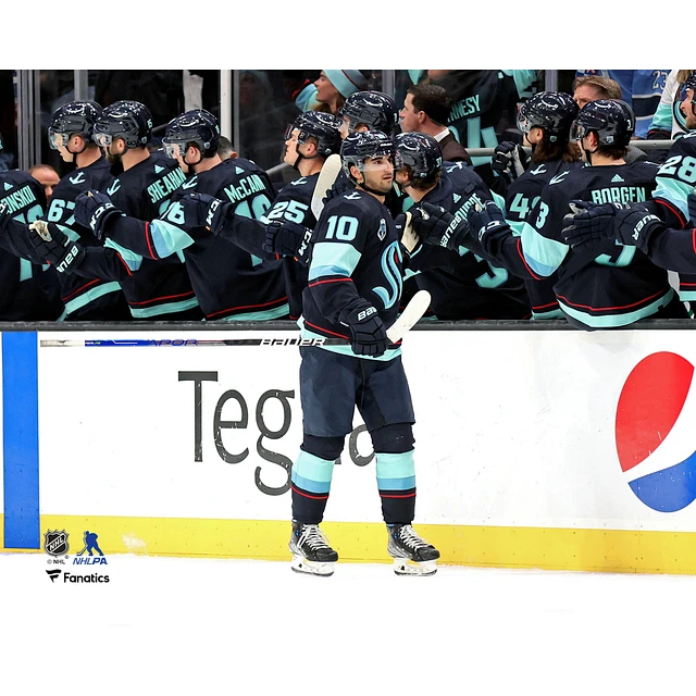 Matty Beniers Seattle Kraken Unsigned Celebrates with Teammates After Scoring Photograph