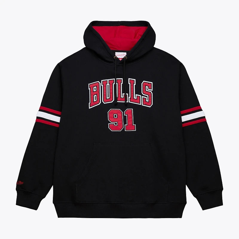 Step into a timeless era of Chicago Bulls basketball with the Dennis Rodman Mitchell & Ness Name & Number Hoodie. This midweight hoodie offers a fleece lining to keep you warm and comfortable, perfect for moderate temperatures. Embroidered fabric applique team graphics and the player's name and number on the front and back showcase your Chicago Bulls pride, while contrast-color stripes sewn onto the sleeves add a stylish touch.
