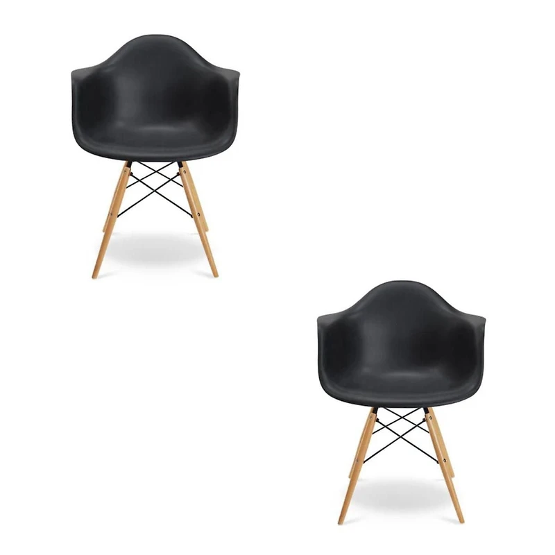 The chair seat, arms, and backrest are molded with solid polypropylene (PP) plastic, a sturdy recyclable material. The Eiffel style legs are made with solid beech wood in a natural wood color, showcasing its beautiful wooden grain