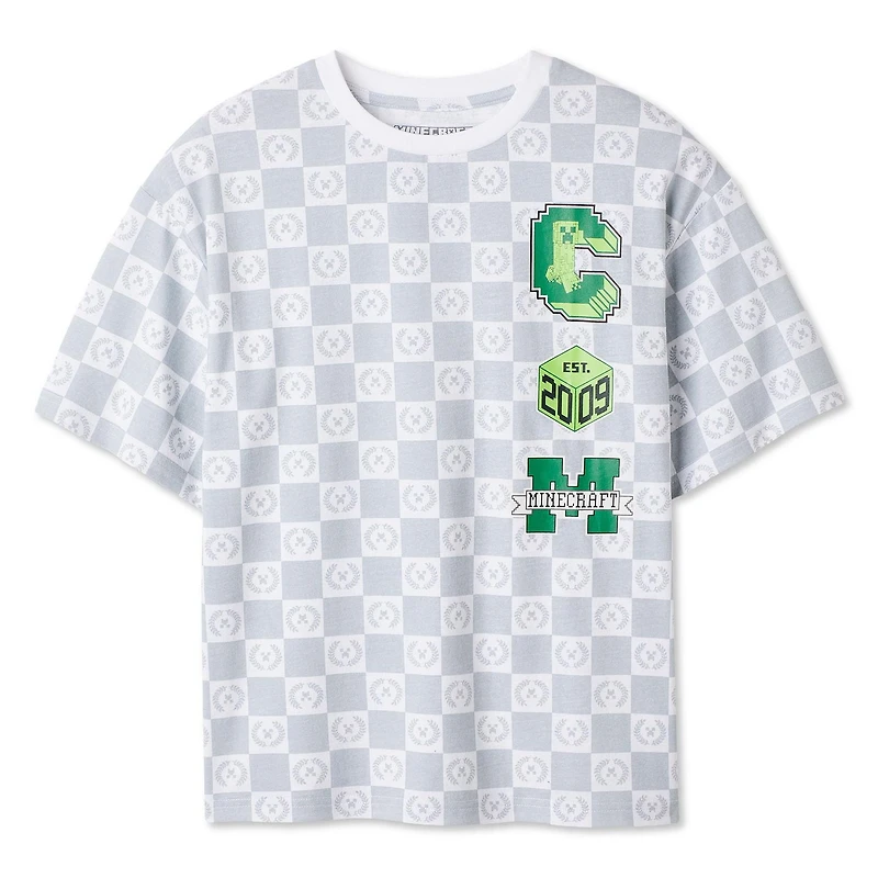 Level up his everyday wardrobe with the cool styling of Minecraft boys’ varsity checkered T-shirt. Made of soft jersey knit, it keeps him comfy through school days and weekend hangs. The T-shirt is designed with a crew neck, short sleeves, dropped shoulders, an all-over print, and a straight hem. It pairs easily with jeans, shorts, or joggers for casual style that stays in his wardrobe through the seasons.