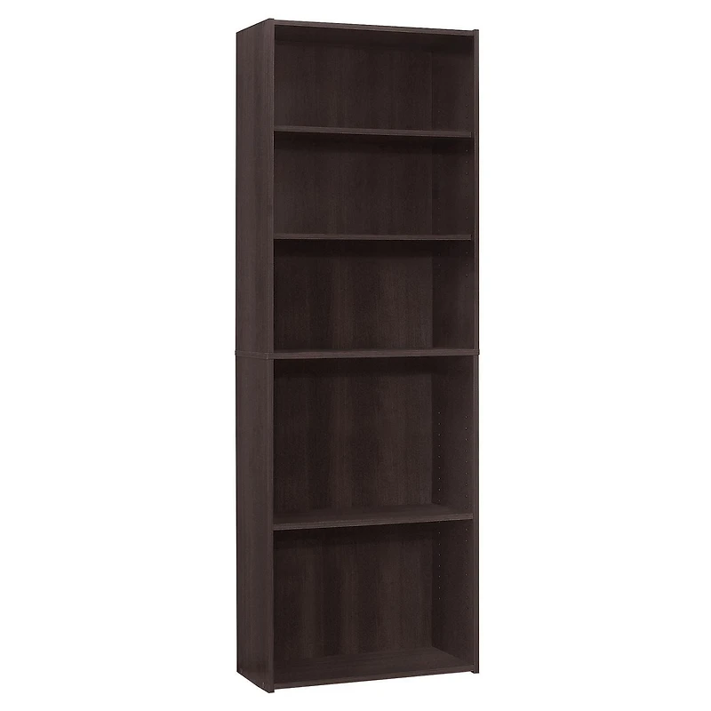 This 5-shelf bookcase in a simple, clean and space-saving design makes it a versatile storage option for any room in your home. The strong adjustable shelving allows for various sized objects to be displayed in your own creative way. Constructed from engineered materials in a warm cappuccino laminate finish, this transitional style bookcase can easily be used in a living room, home office, or bedroom to store books, toys, and decorative accents. Tipping hardware is included to secure safely to a wall. Assembly is required.