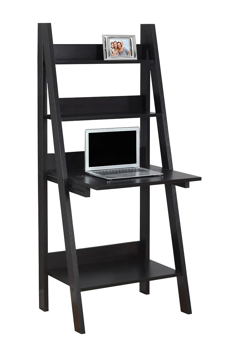 This multifunctional computer desk / bookcase offer a compact work space that is ideal for apartments, condos, or small homes. With clean lines in a reclaimed wood-look finish, this desk will blend easily with your home decor. The top ladder style shelves can be used to display pictures and decorative pieces, while the closed storage area can be dropped down into a desk, with an additional bottom shelf for books or accessories. Add this convenient piece to your home for a functional workstation, where ample storage options, excellent functional features, and sophisticated style come together.