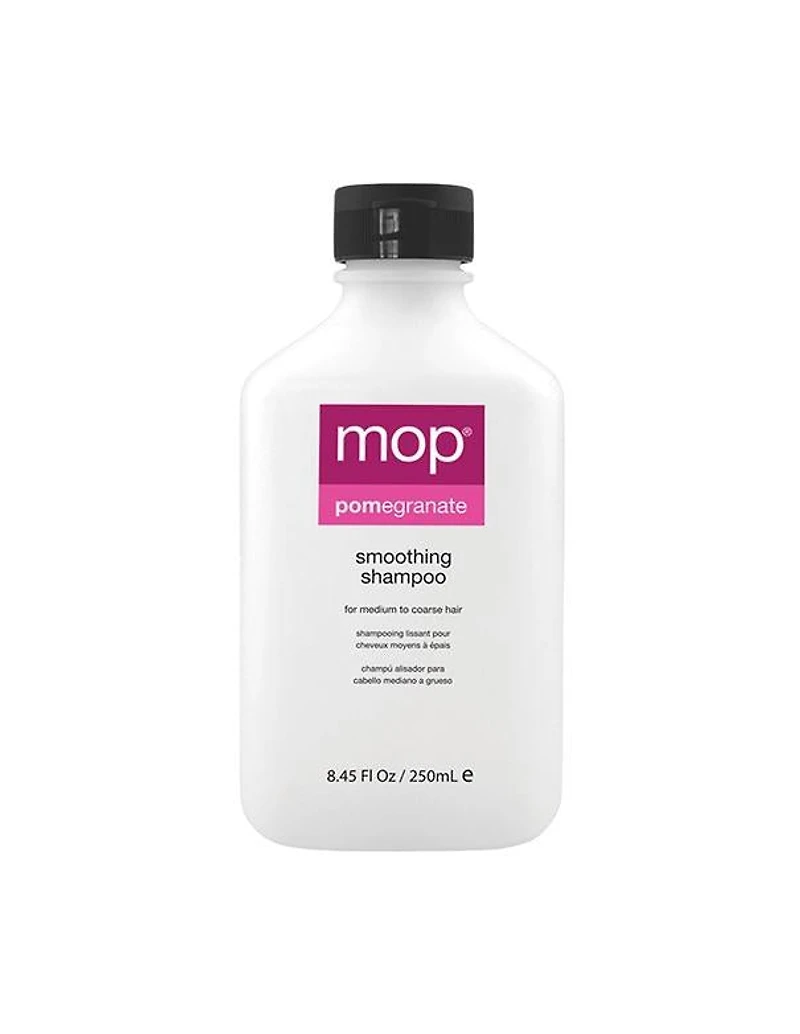 MOP Pomegranate Smoothing Shampoo - 250ml For medium to coarse hair. Soft and silky hair at is finest. This Smoothing Shampoo features Punicic Acid and is packed with vitamins A, K & C. Encourages strong strands and roots, while increasing circulation for a healthy scalp. Our exclusive POMegranate Enzyme provides incredible moisture and antioxidant support. Argan and Coconut Oils work with Phospholipids to smooth, nourish and repair medium to coarse hair. 100 % Vegan. Never tested on animals. No added Sulfates, Parabens or Sodium Chloride. Infused with fruits, vegetables and botanicals. Use Apply dime to quarter size amount to wet hair, massage into hair and scalp. Rinse well.