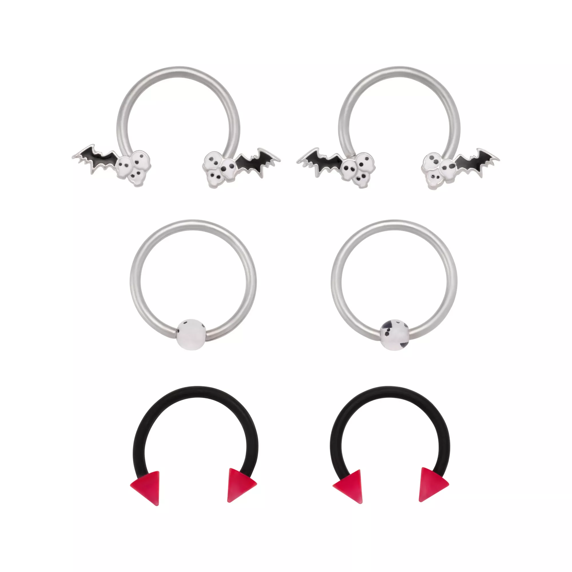 Multi-Pack Bat Skull Horseshoe Rings and Captive Rings 3 Pair - 16 Gauge
