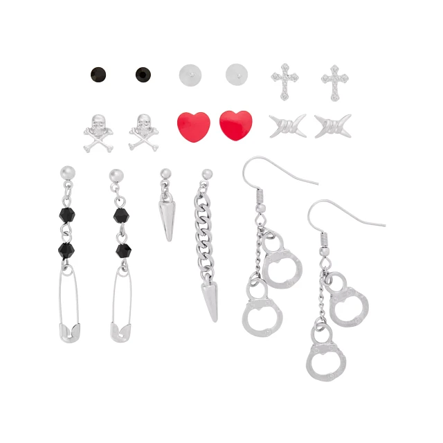Multi-Pack Cross Skull Safety Pin Handcuff Earrings - 9 Pair