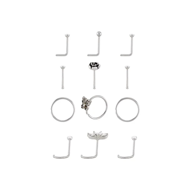 Multi-Pack CZ Butterfly Rose Silvertone Nose Pins L-Bend Hoop and Half Hoop and Screw Nose Rings 12 Pack - 20 Gauge